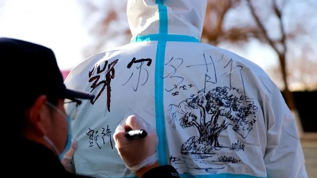 11月11日,经内蒙古自治区新冠肺炎疫情防控工作指挥部医疗防控组同意,额济纳旗达来呼布镇由高风险地区调整为低风险地区。这一激动人心的消息令奋战疫情防控一线的阿拉善盟全警和异地援额警力欢呼雀跃! 在同一天,按照疫情防控指挥部的部署,来自公安厅工作组及四个盟市公安机关支援警力在出色完成援额期间的疫情防控工作任务后,把各自值守的疫情防控点转交阿拉善盟公安机关警力继续坚守。这一天,是他们坚守额济纳“疫”线的最后一天。 下午两点,在额济纳旗一个集中隔离点,阿拉善盟公安局交管支队民警黄帆正在鄂尔多斯民警辛武勋的防护服上画着一棵特别的胡杨树。黄帆说道:“兄弟战友来帮助我们,真的非常感动,所以想在换防的时刻以这样特别的方式‘留’给他们一棵胡杨作为纪念,表达心中的感谢之情。”辛武勋看着身上的胡杨说:“这次来到额济纳,没想到是以这样的方式‘看’胡杨,真的非常难忘,我会将它拍成照片好好珍藏。”