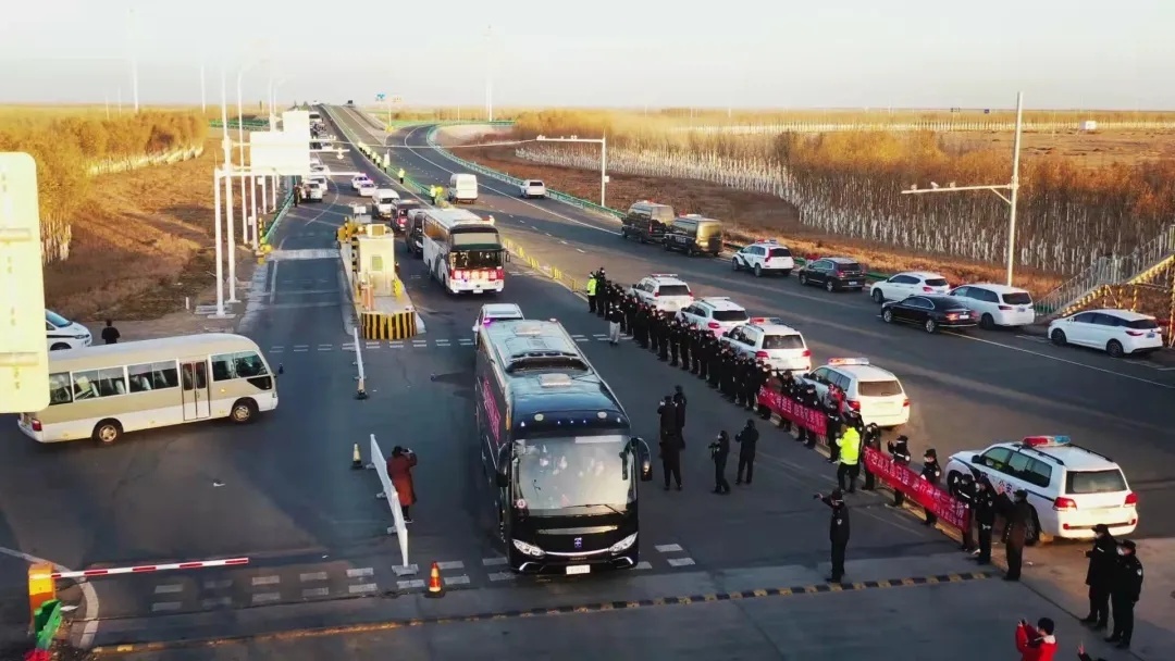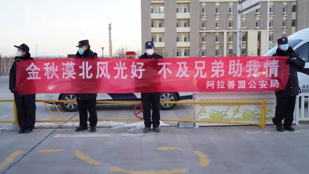 “金秋漠北风景好,不及兄弟助我情”“待到胡杨洒金时,与警相约额济纳”。11月12日早上8点,援助额济纳旗的公安厅工作组及四个盟市公安机关支援民警在出色的完成了额济纳旗的疫情防控工作任务后,踏上了回家的旅程,阿拉善盟公安民警手持标语,向这些并肩作战19天的战友致敬! 阿拉善盟公安局党委副书记、副局长刘志刚说:“战友们和我们共担风雨,一起站岗值班,一起调查摸排,他们的优良品质和敬业精神值得我们钦佩,他们的职业素养,工作作风值得我们学习,他们的巨大支持给了我们抗击疫情无穷的力量和必胜的信心。战友们离别阿拉善,说心里话我们非常不舍,祝愿战友们归途平安,阿拉善人民永远感谢他们,苍天般的阿拉善永远欢迎他们。”
